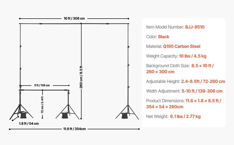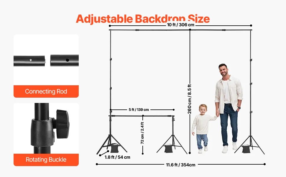 Dimensioni regolabili: il nostro supporto per sfondo regolabile supporta sfondi fino a 260 x 300 cm (8,5 x 10 piedi). L'altezza delle aste di supporto può essere regolata da 2,4 piedi (72 cm) a 8,5 piedi (260 cm) e la larghezza da 139 cm a 306 cm per adattarsi a diverse dimensioni di sfondo