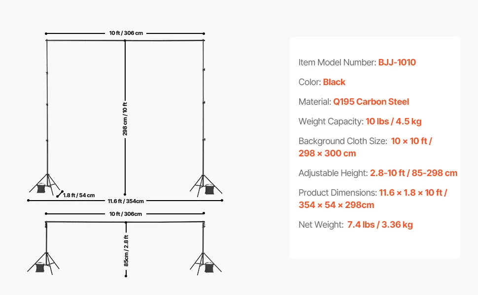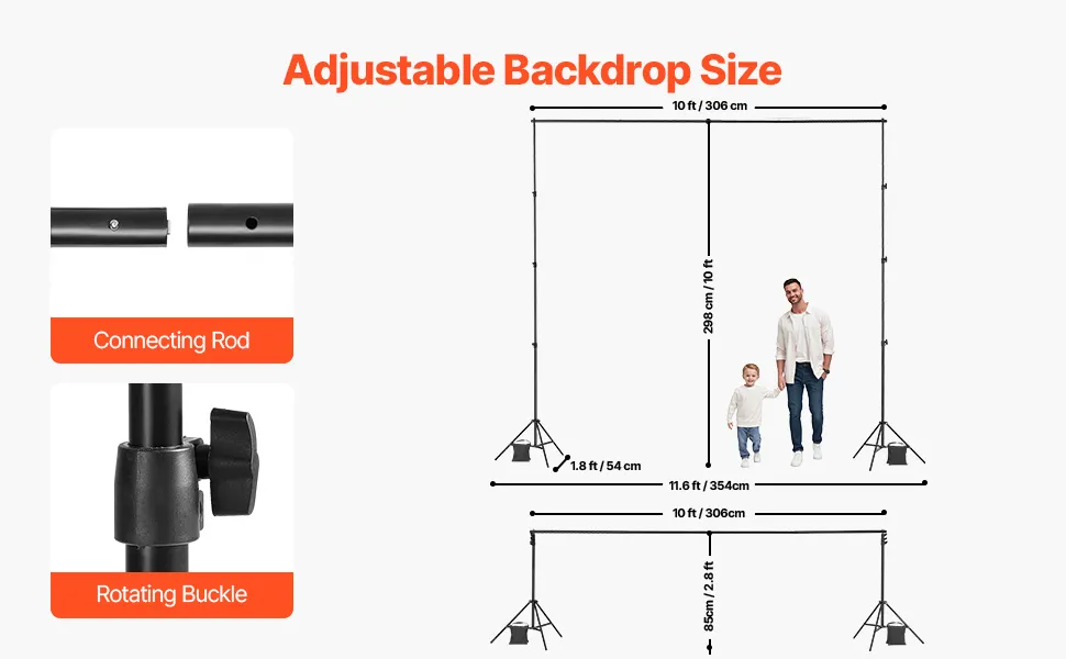 Dimensioni regolabili: il nostro supporto per sfondo regolabile supporta sfondi fino a 300 x 300 cm (10 x 10 piedi). I pali di supporto possono essere estesi da 85 cm (2,8 piedi) a 298 cm (10 piedi) per adattarsi a sfondi di diverse dimensioni