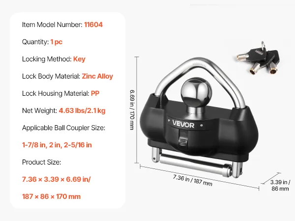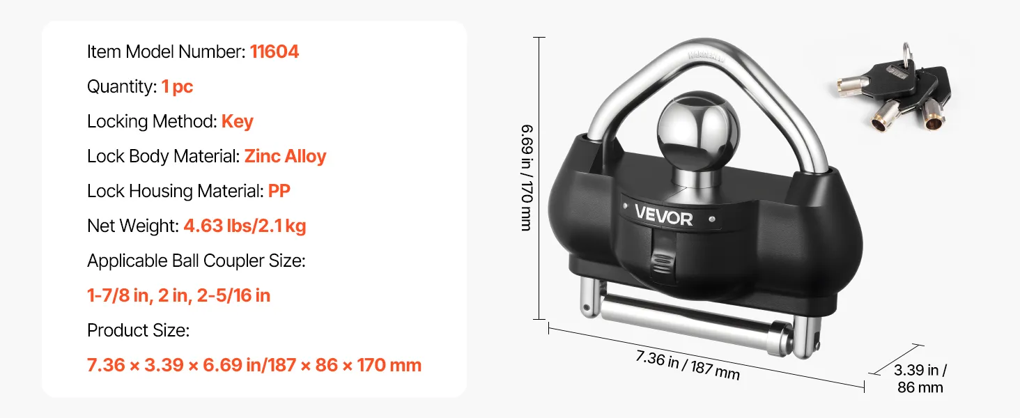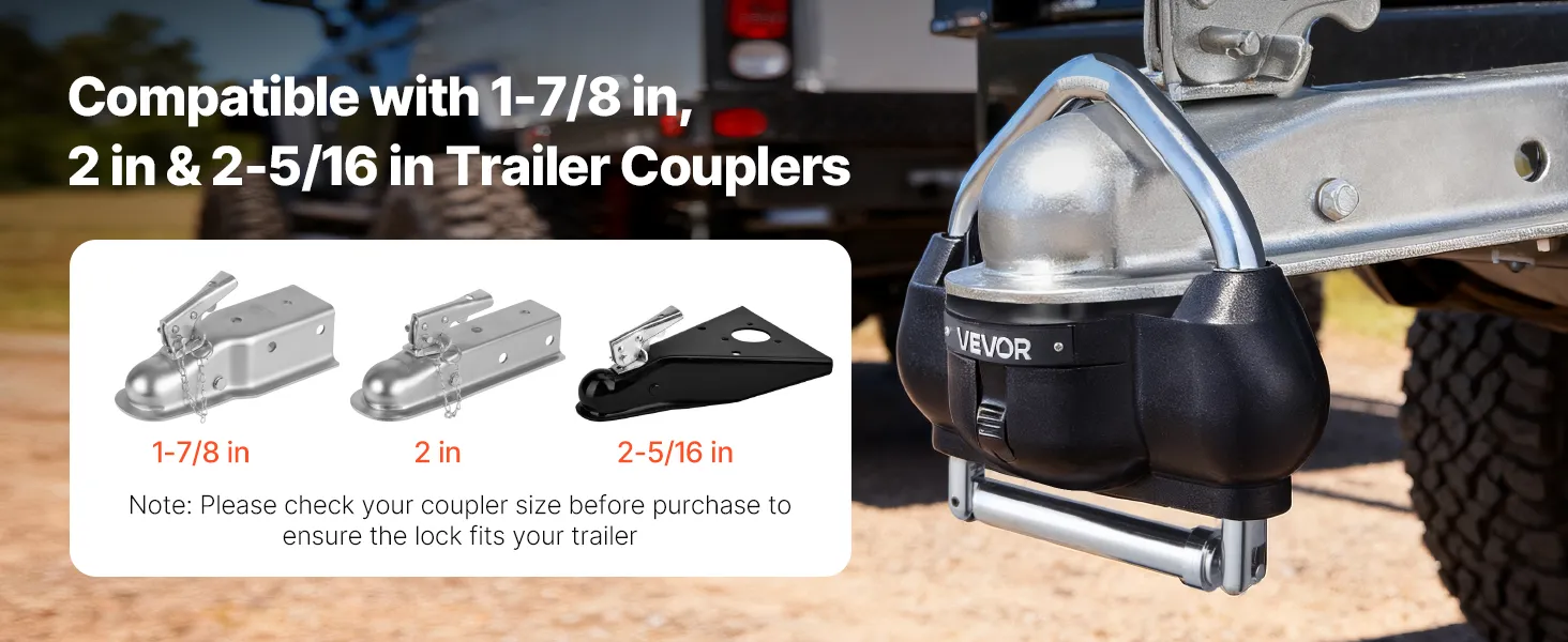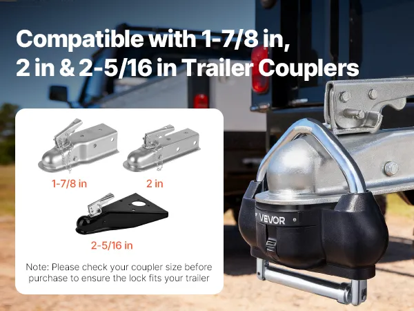 Il nostro blocco per gancio di traino è compatibile con ganci di traino da 1-7/8", 2" e 2-5/16", offrendo un'ampia adattabilità. Si prega di verificare le dimensioni del gancio prima dell'acquisto per assicurarsi che il blocco sia compatibile con il rimorchio.