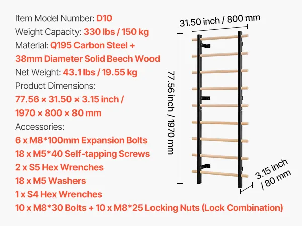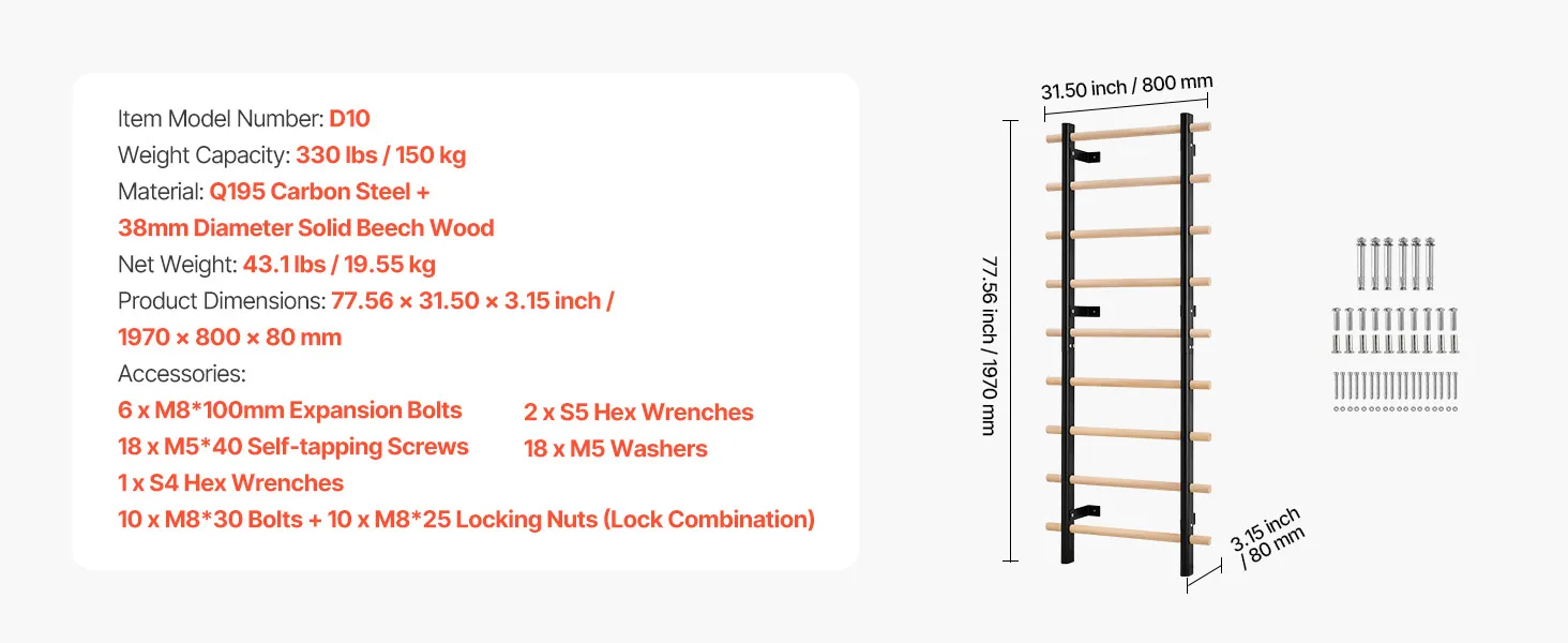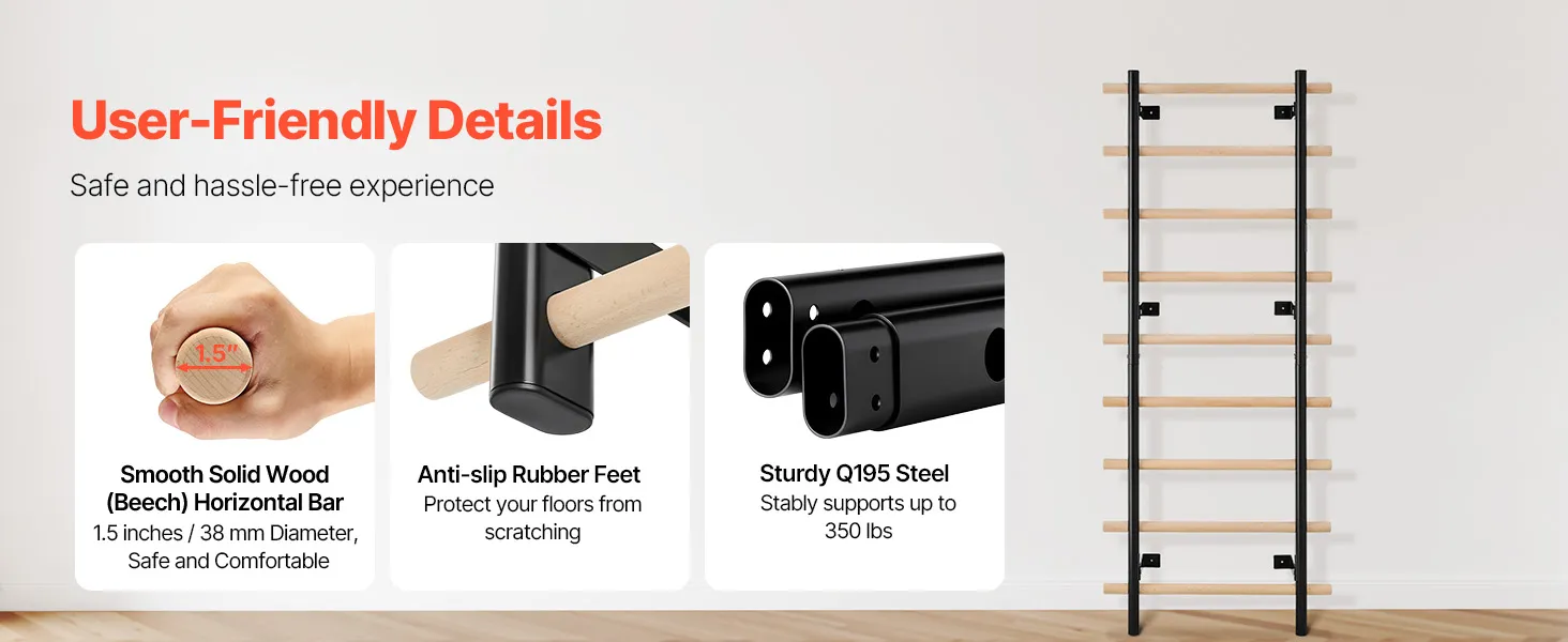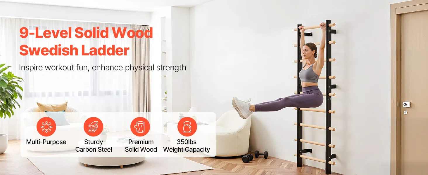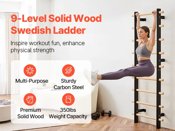 Questa scala svedese a 9 livelli VEVOR è realizzata in massello di faggio e ha una robusta struttura in acciaio al carbonio, in grado di supportare fino a 150 kg. È ideale per ginnastica, danza classica, core training e molto altro.