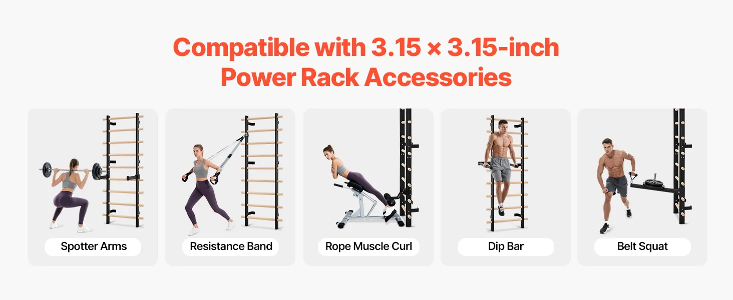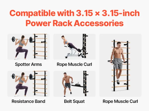 Progettato con un telaio in acciaio al carbonio, questo trainer di sospensione a scala svedese è compatibile con gli accessori del power rack da 3,15 × 3,15 pollici, come curl con corda, braccia da spotter, squat con cintura, barre per dip e fasce di resistenza.