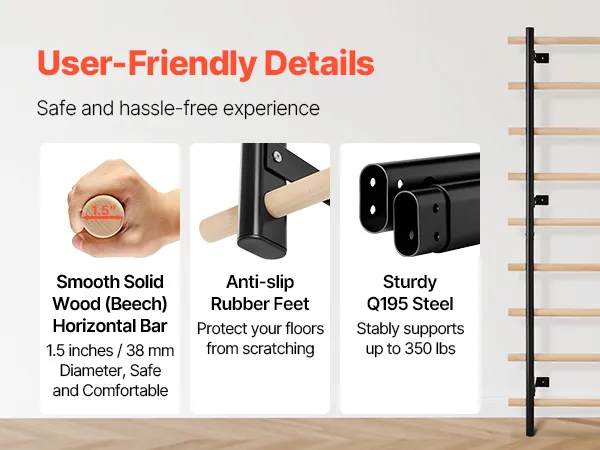 Le nostre sbarre da ginnastica in legno offrono una presa sicura e confortevole. I piedini in gomma antiscivolo mantengono la scala a muro stabile, proteggendo al contempo i pavimenti dai graffi.