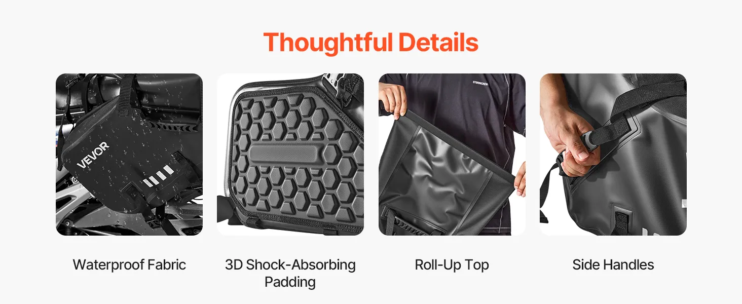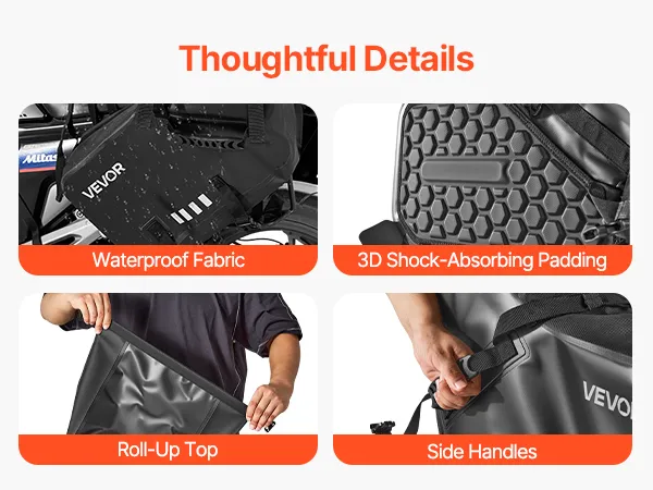Ogni dettaglio della nostra borsa da sella impermeabile per moto è pensato per la praticità. L'imbottitura a nido d'ape 3D e le doppie maniglie laterali riducono l'impatto delle vibrazioni sui tuoi effetti personali e ne facilitano la movimentazione.