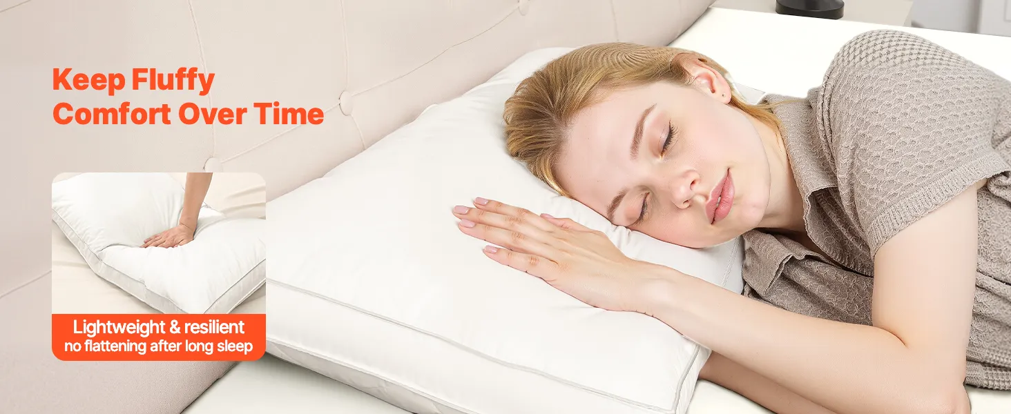 Adatto a tutte le posizioni di sonno: la morbida e soffice imbottitura in piumino d'oca del comodo cuscino è ideale per chi dorme cambiando posizione durante la notte, offrendo comfort sia che si dorma su un fianco, sulla schiena o a pancia