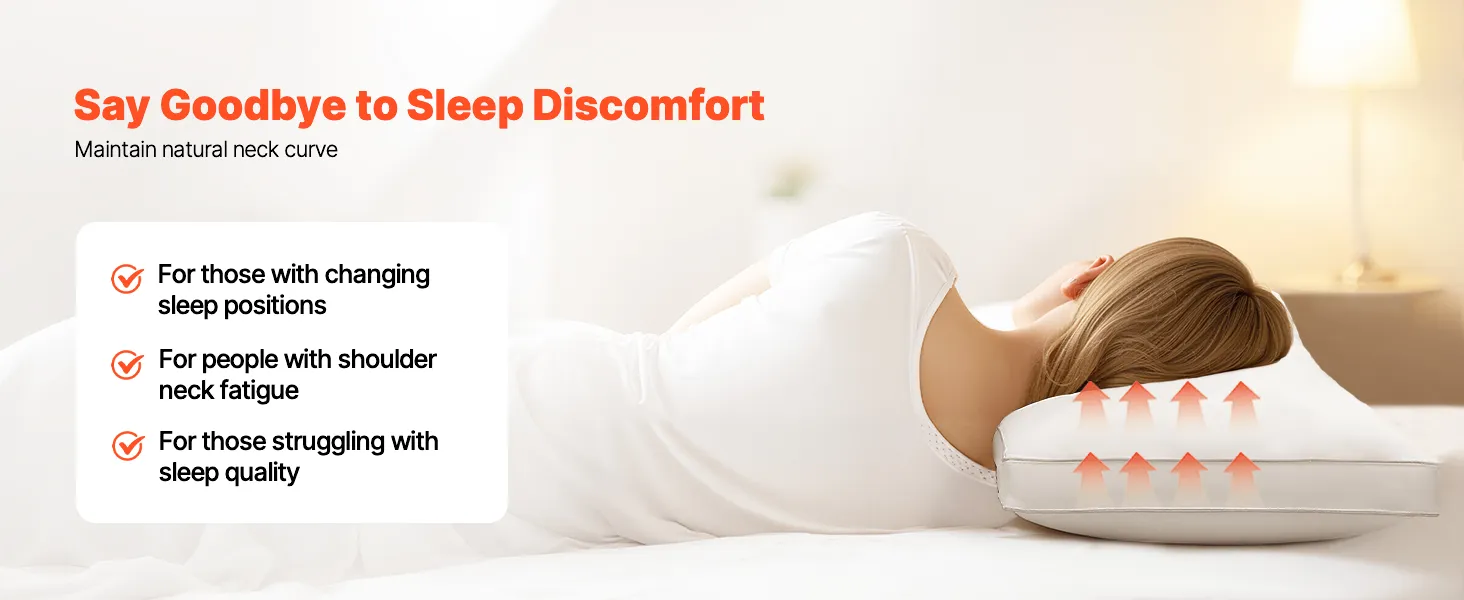 Il nostro cuscino per dormire mantiene la curvatura naturale del collo, alleviando i punti di pressione e supportando i cambiamenti di posizione durante il sonno, l'affaticamento del collo e la scarsa qualità del sonno, per notti di riposo.