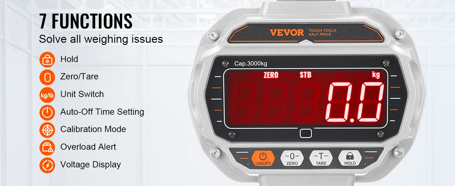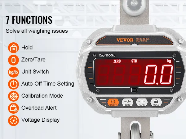 La bilancia da gru può pesare da 18,1 kg a 3000 kg. Grazie a un sensore sensibile che pesa con una precisione di 0,5 kg, ci sono 7 fantastiche funzioni da scegliere.