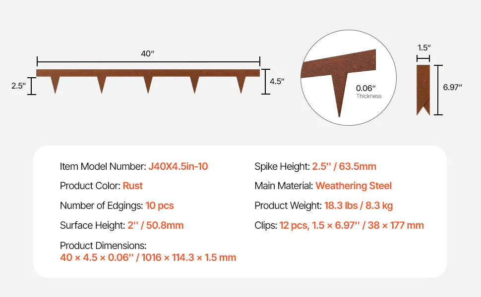Resistente alle intemperie e alla ruggine: realizzata in acciaio resistente alle intemperie, questa bordatura per prato è pre-arrugginita ai bordi. Nel tempo, la ruggine si approfondisce, creando uno strato protettivo che migliora la resistenza alla corrosione ed evita le crepe. Una volta che la ruggine è completamente formata, puoi applicare uno strato di vernice poliuretanica per fissare il colore e prolungarne la durata