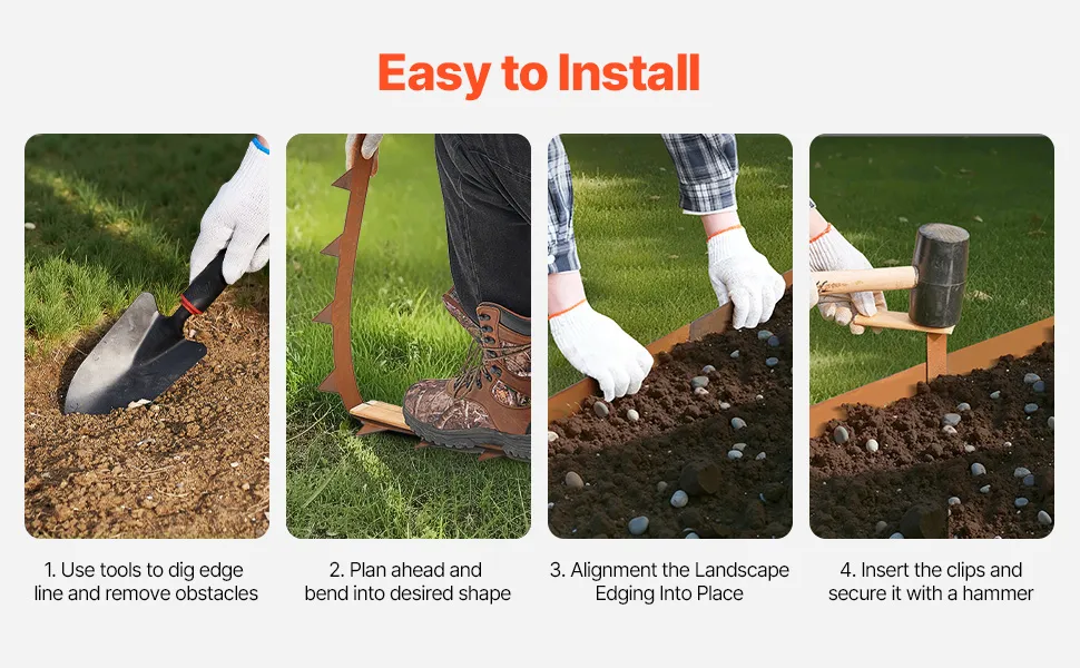 Flessibile e pieghevole: la bordatura in acciaio è altamente flessibile e può essere facilmente piegata per adattarsi alla forma unica del tuo giardino, che sia quadrata, circolare o irregolare. Si piega senza sforzo senza rompersi, offrendoti una vestibilità su misura per qualsiasi design del giardino