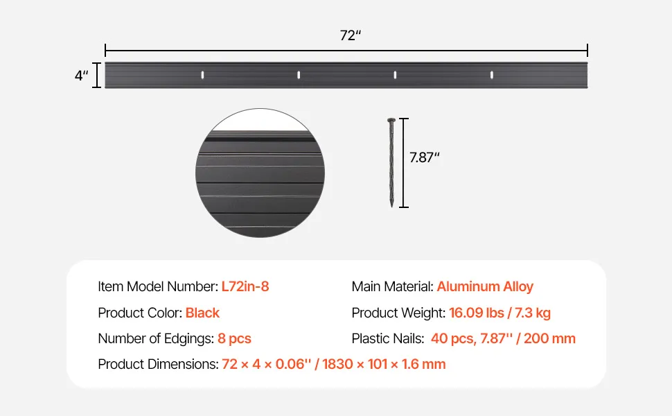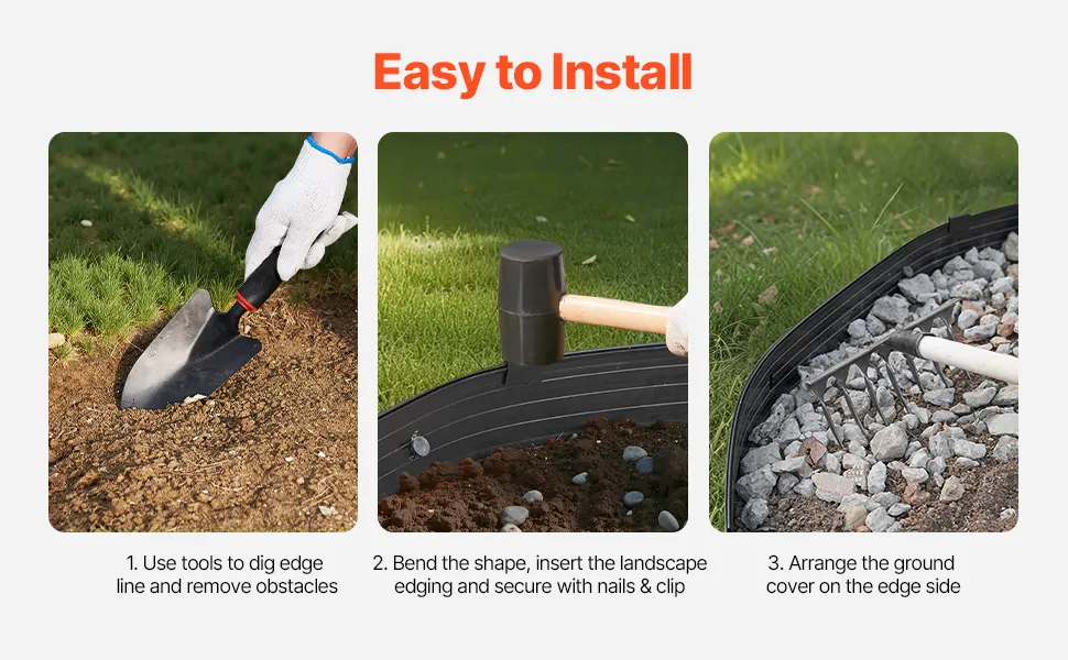 Installazione semplice: installare la bordatura del tuo paesaggio è un gioco da ragazzi. Fissa semplicemente ogni pezzo con i chiodi inclusi e morsetti aggiuntivi per una maggiore stabilità. Non sono richiesti utensili specializzati per l'installazione.