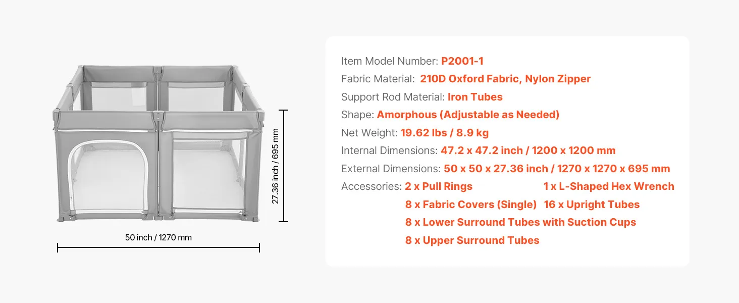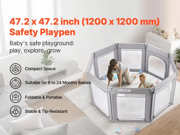 Spazio di gioco sicuro: il box per bambini compatto VEVOR da 47,2 x 47,2 pollici (1200 x 1200 mm di dimensioni interne) offre un'area di gioco sicura per bambini dai 6 ai 24 mesi. Offre ampio spazio al bambino per gattonare, stare in piedi