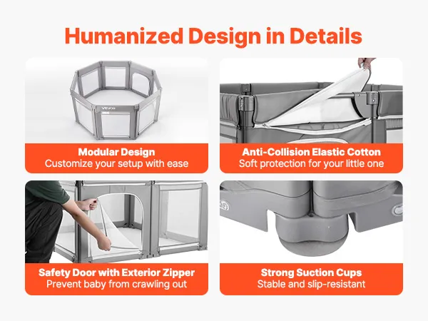 Dotato di morbido cotone elastico, porta di sicurezza con cerniera esterna e potenti ventose, questo recinto per bambini da interno e da esterno offre uno spazio sicuro e divertente da esplorare per il tuo bambino.