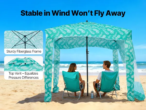 Il robusto telaio evita piegamenti o deformazioni in caso di vento. Il sistema di ventilazione superiore equalizza la pressione dell'aria interna ed esterna, mantenendo stabile la grande cabina da spiaggia e favorendo al contempo il flusso d'aria.