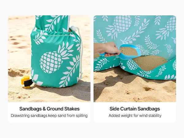 Ogni angolo della tenda cabana è dotato di sacchi di sabbia e picchetti per un ancoraggio sicuro. Anche la tenda laterale è dotata di sacchi di sabbia per evitare che voli via, e il peso della sabbia ne aumenta la stabilità complessiva.
