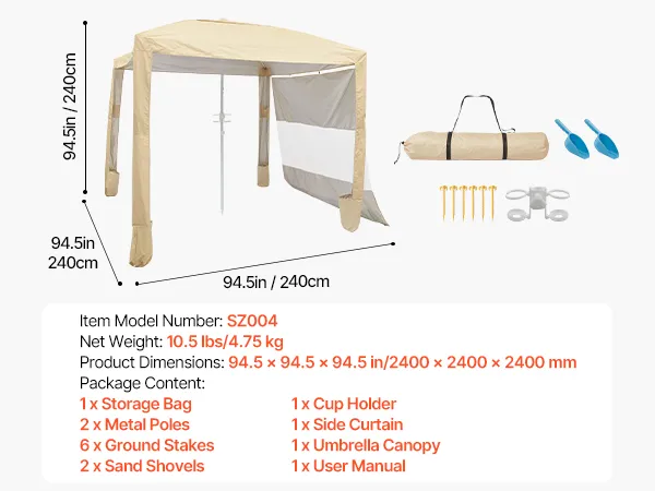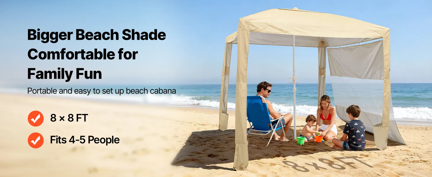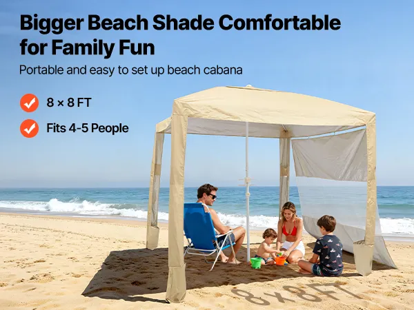 Cabana da spiaggia 2,4 x 2,4 metri: questa spaziosa cabana da spiaggia con tenda laterale può ospitare comodamente da quattro a cinque persone, sedie e attrezzatura. Progettata con portabicchieri e tasche portaoggetti