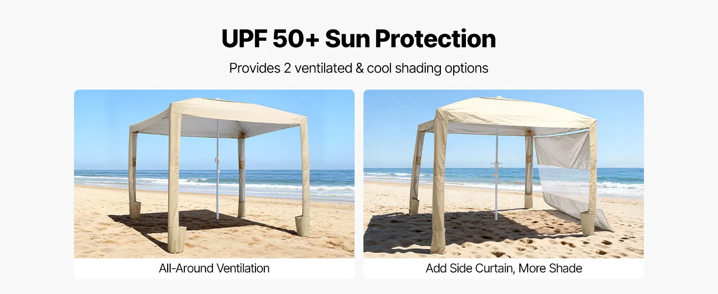 Protezione solare UPF 50+: realizzata in tessuto 210D resistente al sole, la tenda da spiaggia Cabana offre ombra. La tenda laterale è dotata di rete traspirante, che favorisce il flusso d'aria e dissipa il calore per creare un ambiente più fresco