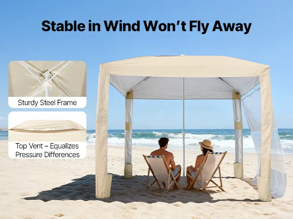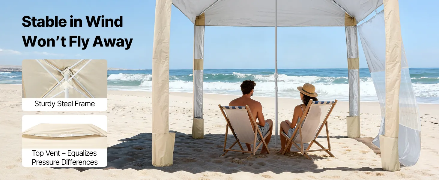 Resistenza al vento di livello 4-5: dotata di un robusto telaio in acciaio, un palo principale avvitabile, sacchi di sabbia e picchetti per il fissaggio a terra, questa tenda cabana facile da montare rimane saldamente ancorata alla sabbia