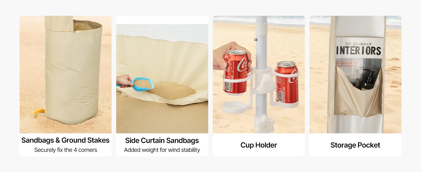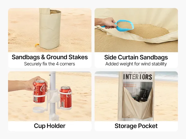 Ogni angolo della tenda cabana, facile da montare, è dotato di sacchi di sabbia e picchetti per un ancoraggio sicuro. Anche la tenda laterale è dotata di sacchi di sabbia per evitare che voli via, e il peso della sabbia migliora la stabilità complessiva.