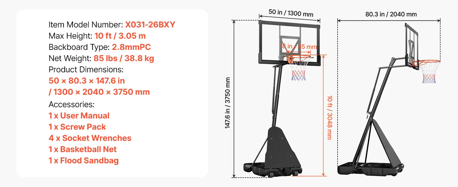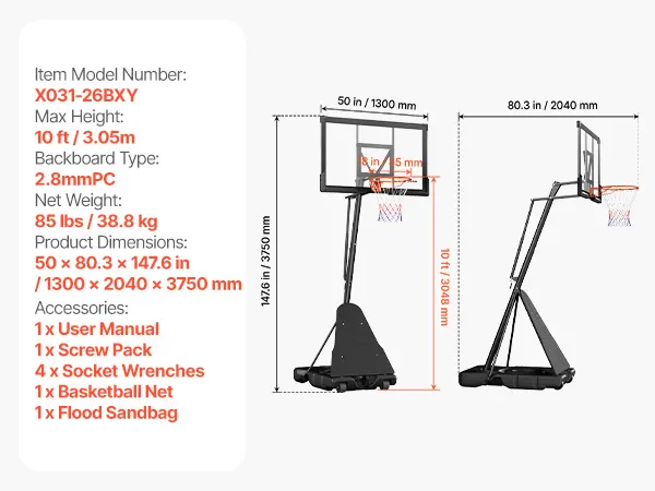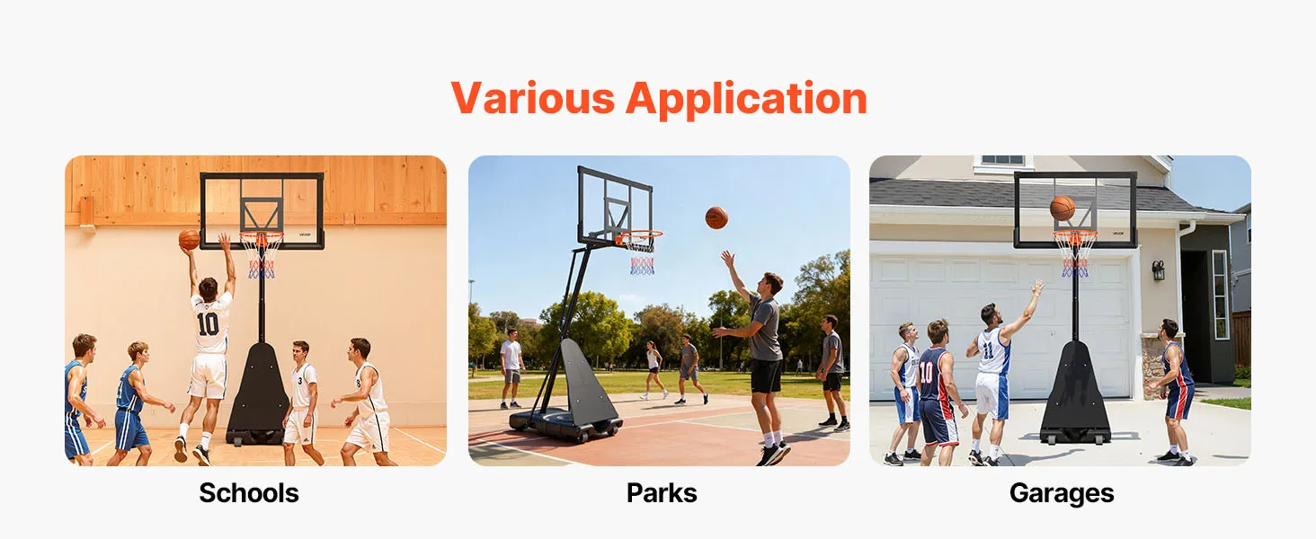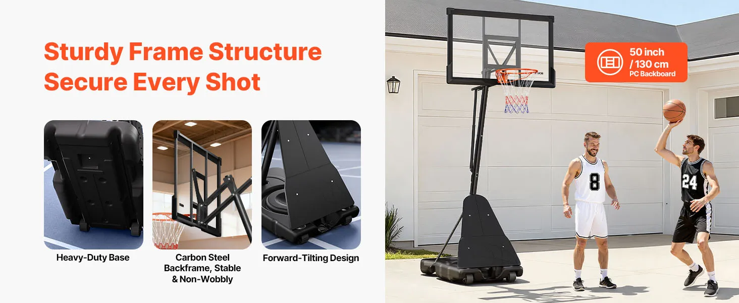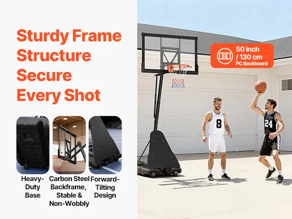 Telaio robusto: questo canestro da basket è dotato di un telaio quadrato in acciaio e di un tabellone in policarbonato, che garantisce stabilità anche durante le partite più intense. La base spessa è resistente all'acqua e alla sabbia
