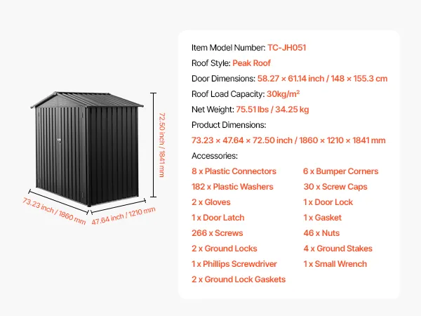 La casetta da giardino in metallo da 1860 x 1210 x 1841 mm è ideale per riporre attrezzi da giardino e altri oggetti. Realizzata in acciaio zincato, è durevole, impermeabile e resistente al sole. Il tetto a due falde impedisce l'accumulo di neve e può sostenere fino a 30 kg/m².