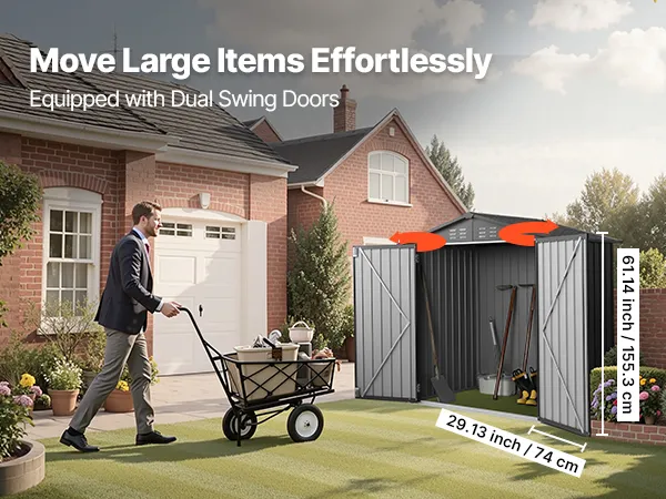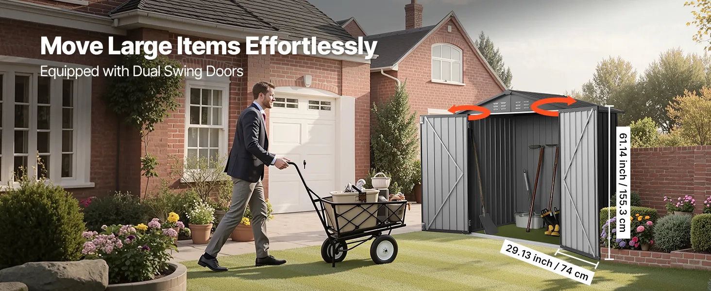 Questo capannone in metallo con pavimento è dotato di doppie porte a battente, che consentono un facile accesso a oggetti ingombranti come tosaerba, biciclette e carrelli portautensili.