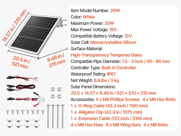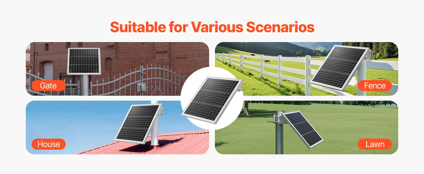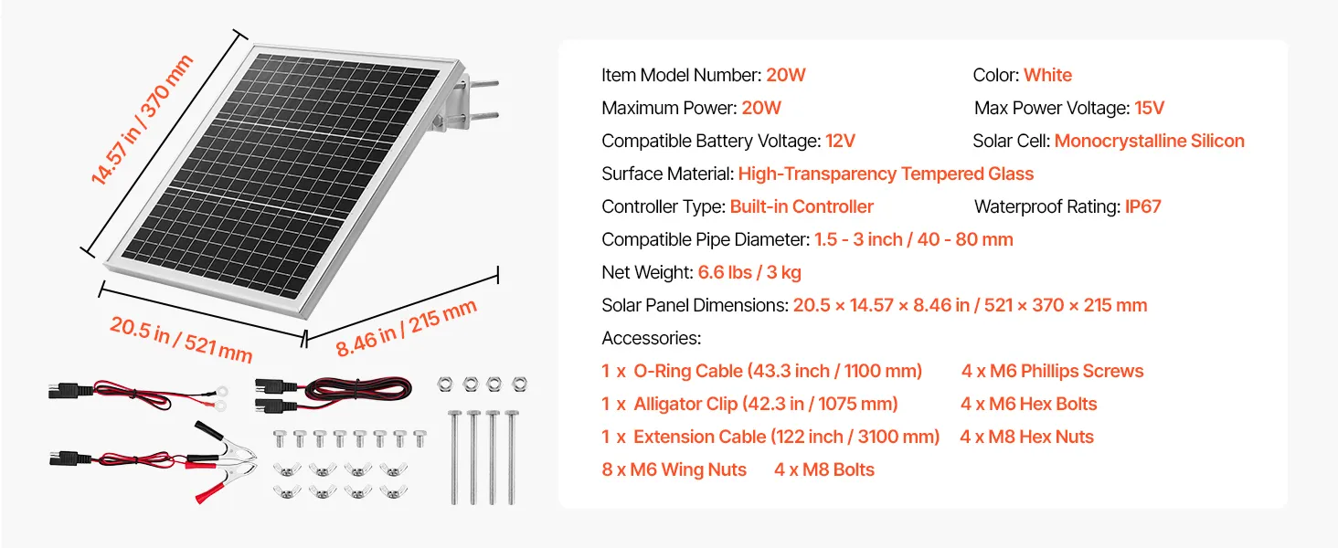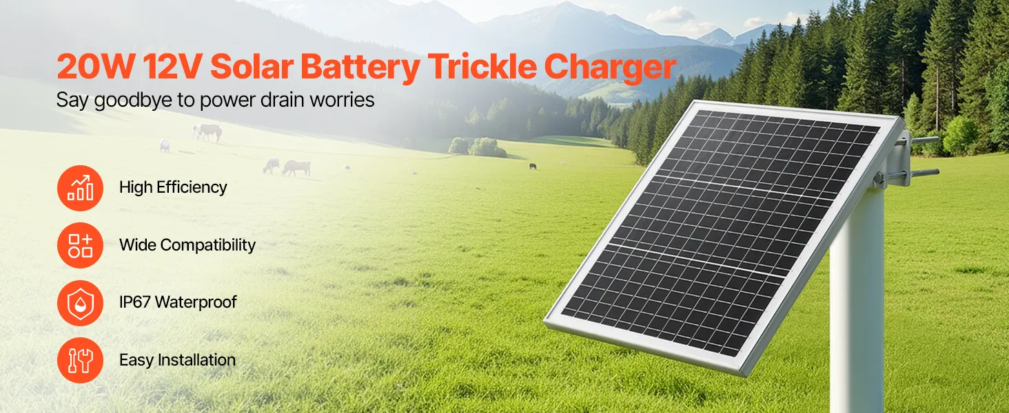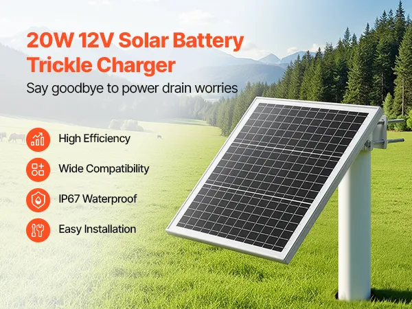 VEVOR Caricabatteria Solare Mantenitore di Carica 20W 12V per Pannelli Solari Cancelli Recinzioni per Fattoria Prato, Caricabatteria Celle Monocristalline con Staffa di Montaggio su Palo IP67