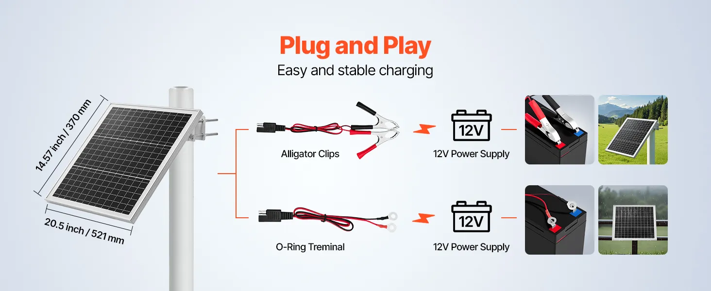 Il nostro caricabatterie/mantenitore solare da 20 W e 12 V sfrutta l'energia solare per caricare in modo affidabile le batterie da 12 V. Dotato di celle solari monocristalline ad alta efficienza, è ideale per apricancelli, recinzioni elettriche, attrezzature agricole e tosaerba.