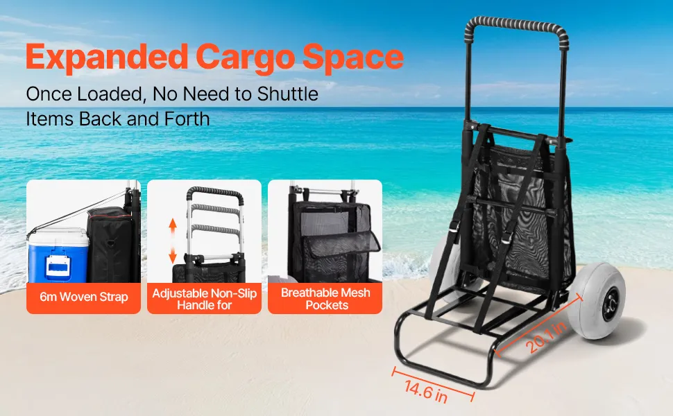 Il carrello da spiaggia VEVOR con grandi ruote per la sabbia è perfetto per l'attrezzatura da spiaggia. Misura 20,1" x 14,6". Questo fornisce abbastanza spazio per i tuoi oggetti. Puoi trasportare frigoriferi portatili, sedie e altro. Il ponte può sopportare carichi pesanti. Quindi, è l'ideale per le gite in spiaggia in famiglia. Con il suo design spazioso, hai abbastanza spazio. E puoi trasportare tutto ciò di cui hai bisogno. Il ponte stesso è robusto e affidabile. Supporta fino a 165 libbre. Ciò lo rende una scelta pratica per coloro che amano le attività in spiaggia. Un ampio ponte completa la funzionalità del carrello.