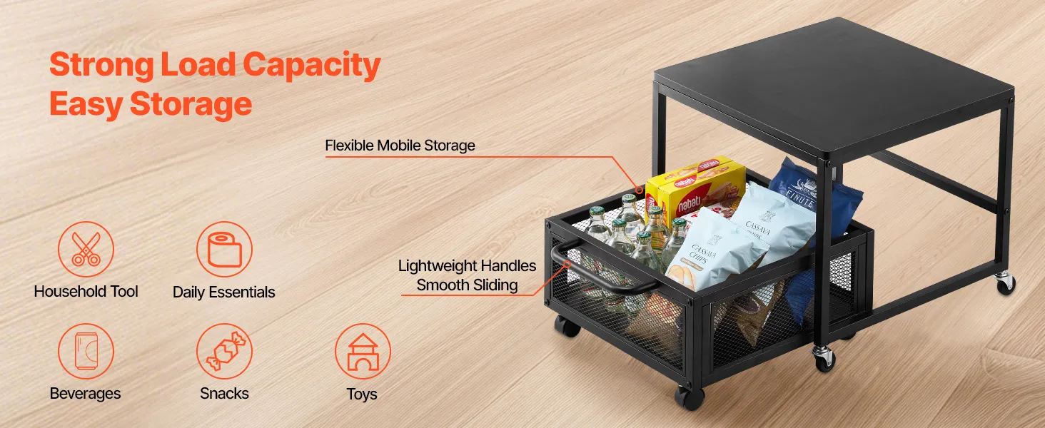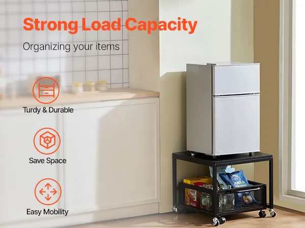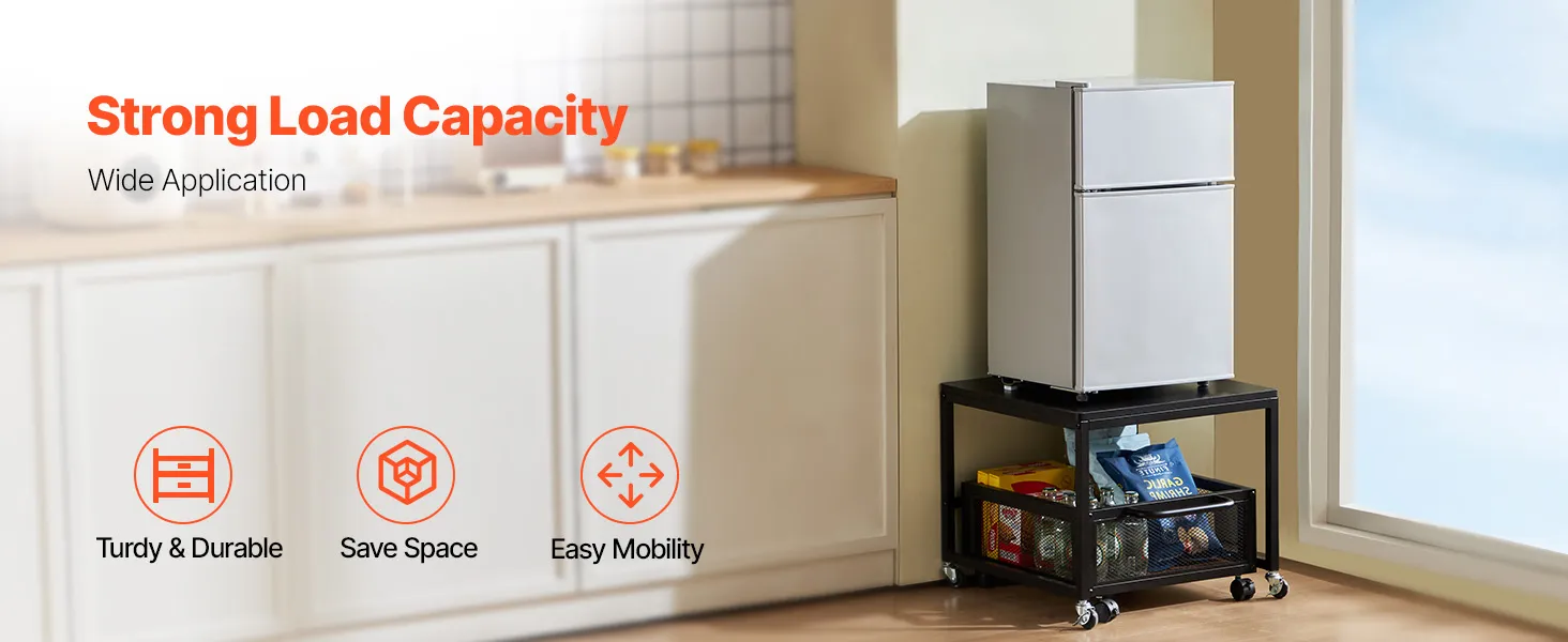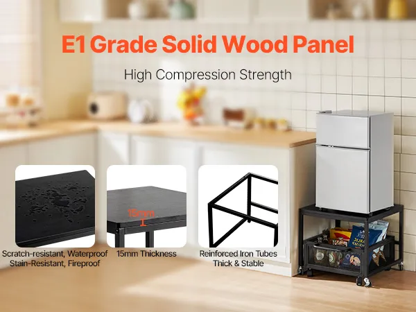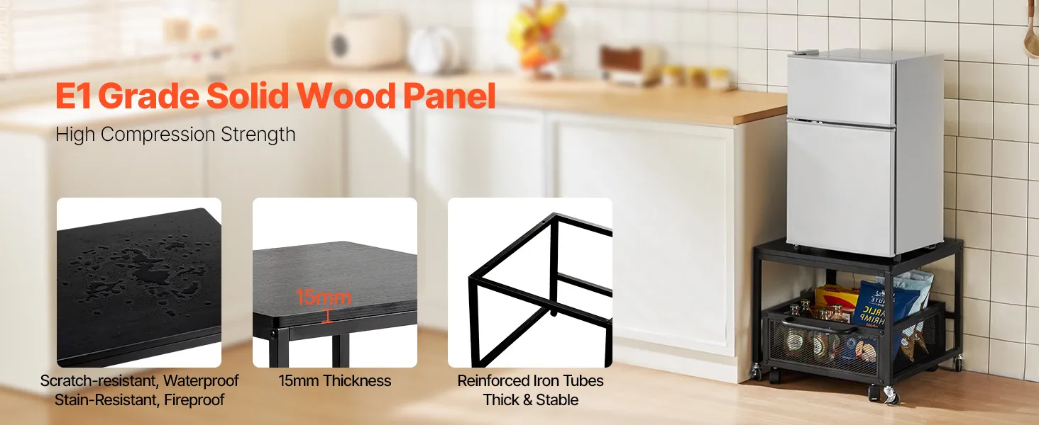 Robusto e durevole: questo mini supporto per frigorifero con contenitore è realizzato con un pannello in legno massello E1 ispessito di qualità e tubi in ferro rinforzati, fornendo una superficie robusta e stabile che può supportare fino a 90 kg (198 libbre). Ideale anche come porta lavatrice, tavolino, porta stampante o carrello multiuso
