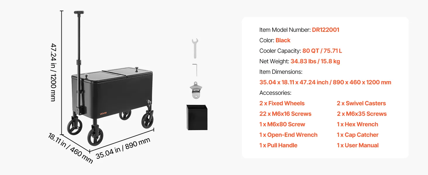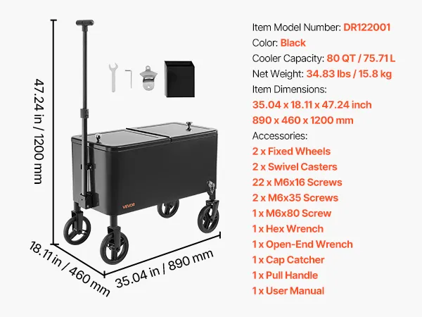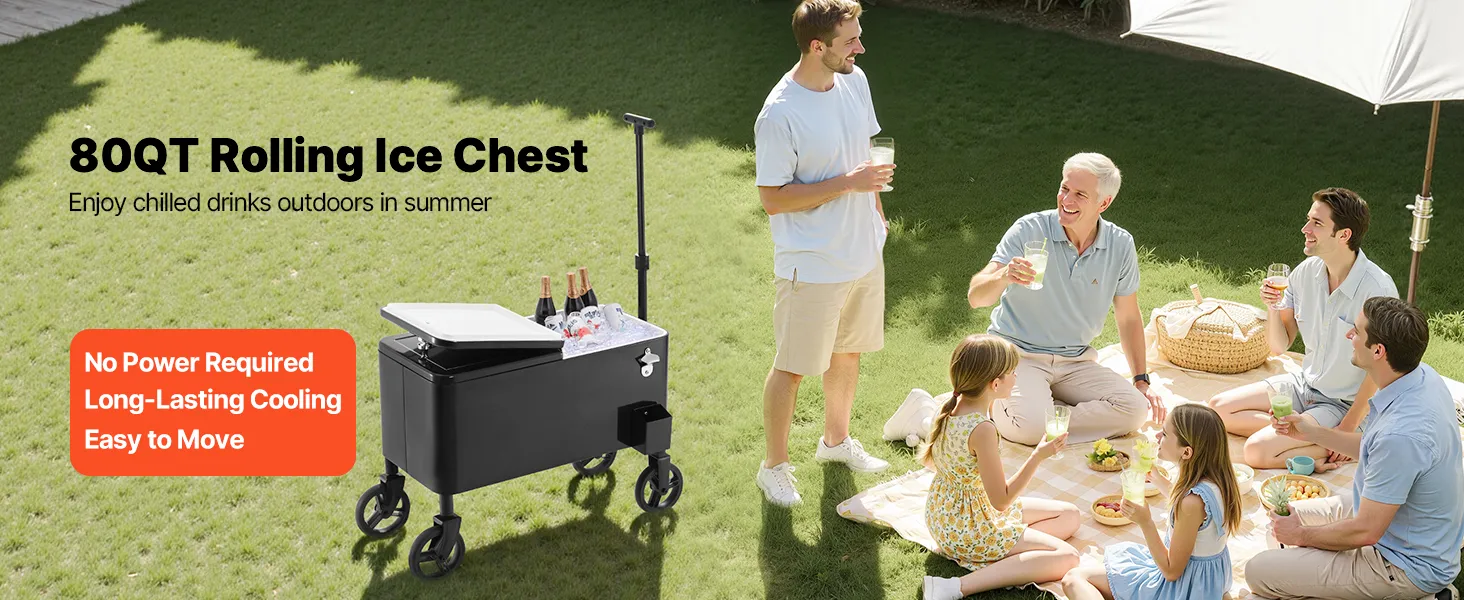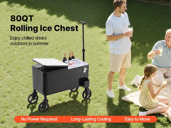 Questo carrello frigo da esterno ha una capacità di 80 litri, che può contenere birra, bevande e ghiaccio in abbondanza. Non richiede elettricità, mantiene gli alimenti freschi per lunghe ore ed è facile da spostare, per un piacere rinfrescante all'aria aperta.