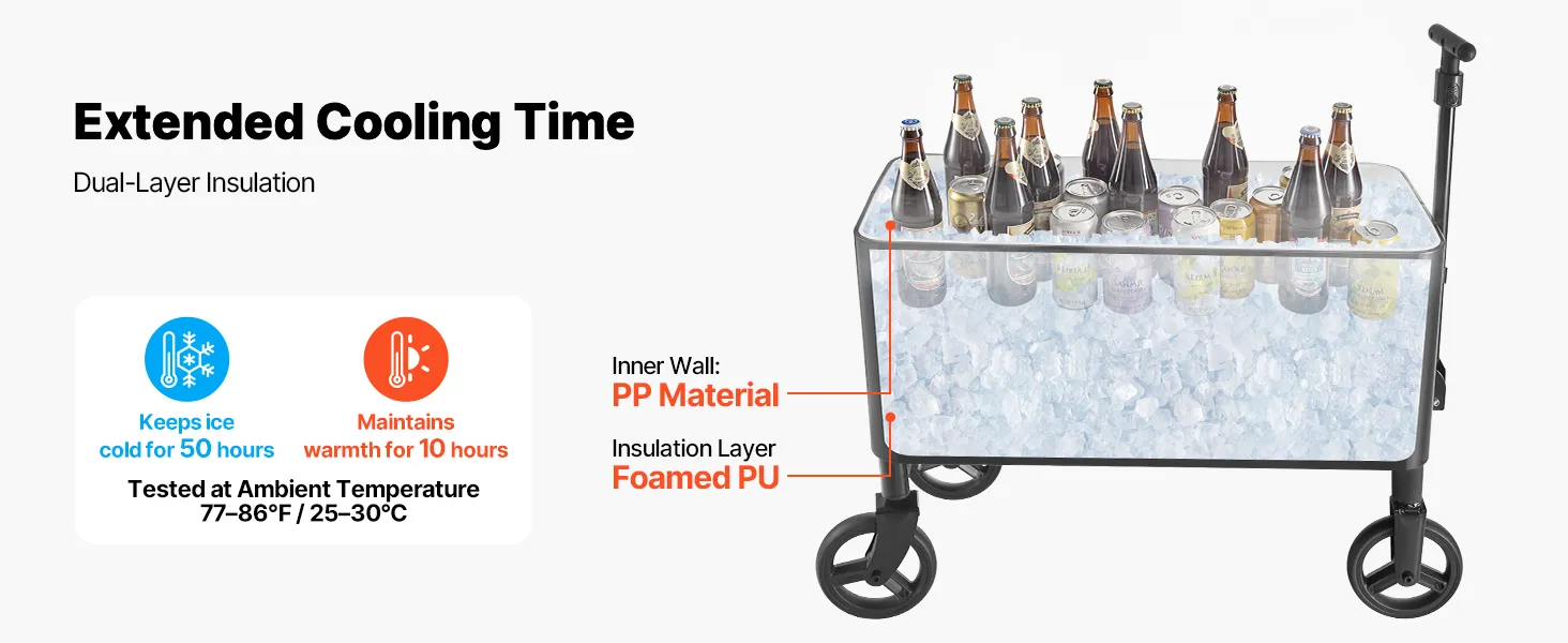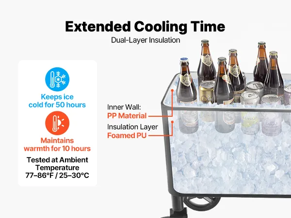 Il nostro refrigeratore per ghiaccio su ruote è realizzato con un rivestimento interno in PP e un isolamento in schiuma PU ad alta efficienza, che trattiene l'aria fredda. Mantiene le bevande fresche fino a 50 ore e calde per 10 ore.