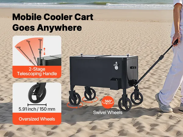 Questa ghiacciaia da esterno è dotata di una pratica maniglia e di ruote girevoli a 360°, che la rendono facile da spostare su erba, patii o sabbia. Il manico telescopico a due sezioni consente di regolare la lunghezza per spingere o tirare in modo fluido e senza sforzo.