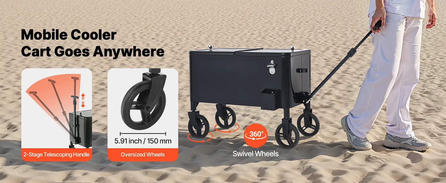 VEVOR Carrello Portaghiaccio, da 75,71 Lcon Ruote, Maniglia Telescopica a 2 Stadi e 2 Ruote Girevoli, Tavolo Portatile per Spiaggia, Patio, Bar, Carrello da Parco all'Aperto su Ruote, Nero