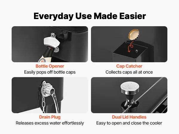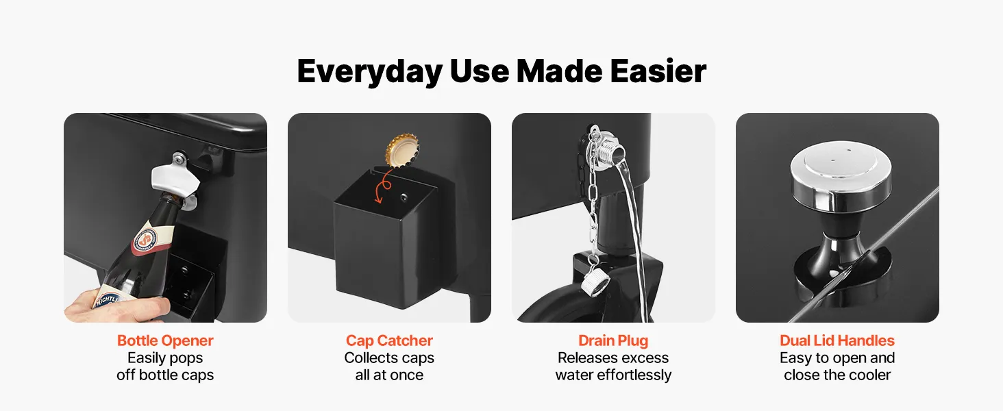 Il carrello è dotato di un raccoglitore di tappi di bottiglia integrato per tenerli in ordine, di un tappo di scarico per un facile rilascio dell'acqua e di doppie maniglie del coperchio che si aprono e si chiudono con facilità, rendendo più comodo l'uso quotidiano.