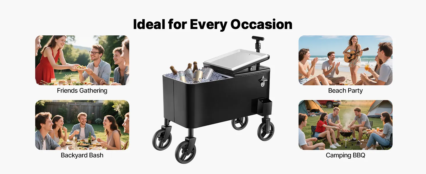 Ideale per riunioni con gli amici, feste in spiaggia, eventi in giardino o barbecue in campeggio, questo carrello frigorifero con ruote mantiene le tue bevande fresche e rende ogni ritrovo estivo più piacevole.