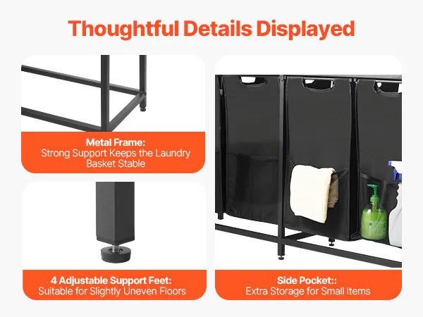 Struttura robusta: la struttura in acciaio al carbonio nero offre un supporto robusto ed è resistente alle deformazioni. È dotato di quattro piedini regolabili in PP che stabilizzano il cesto portabiancheria anche su pavimenti irregolari