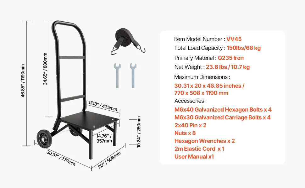 Stoccaggio efficiente: questo carrello porta sedie da pranzo, che misura 770 x 508 x 1190 mm / 30,3 x 20,0 x 46,9 pollici, ha una capacità di peso massima di 150 libbre/68 kg e può contenere sedie pieghevoli di varie dimensioni.