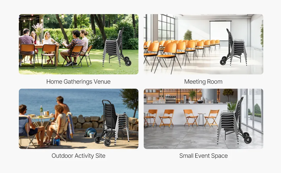 Applicazione versatile: ideale per eventi, scuole, hotel, riunioni all'aperto e molto altro, questo carrello consente di spostare, posizionare e riporre le sedie da pranzo in modo facile e veloce, risparmiando tempo e fatica.