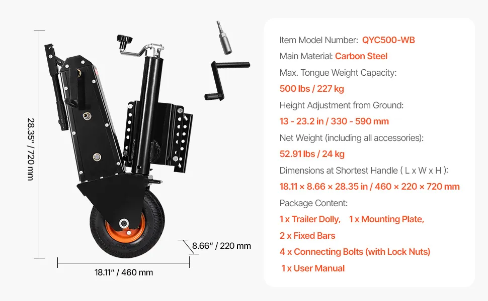 Questo carrello per rimorchi vanta una capacità di carico massima di 500 libbre, garantendo un traino robusto e flessibile per camper, barche e altri veicoli ricreativi, rendendo la gestione del rimorchio semplice e agevole.