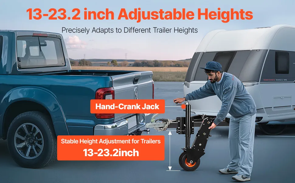 Comodo e facile da usare: questo carrello per il trasporto di rimorchi è dotato di un martinetto a manovella incorporato, che regola facilmente l'altezza tra 13 e 23,2 pollici. Ciò garantisce un controllo stabile durante lo spostamento e si adatta a diverse dimensioni di rimorchi e barche, bilanciando sicurezza ed efficienza