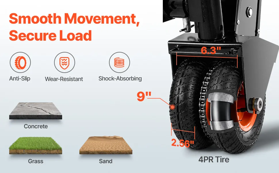 Movimento stabile: dotato di pneumatici in gomma gonfiabili da 9 pollici, questo rimorchio trasportatore offre un'aderenza e una stabilità eccellenti su strade di cemento lisce, aree erbose, terreni irregolari e superfici sabbiose. La spaziatura esterna delle ruote migliora ulteriormente la stabilità e il controllo durante il trasporto. Inoltre, gli pneumatici sono resistenti all'usura e ammortizzanti, garantendo un utilizzo affidabile