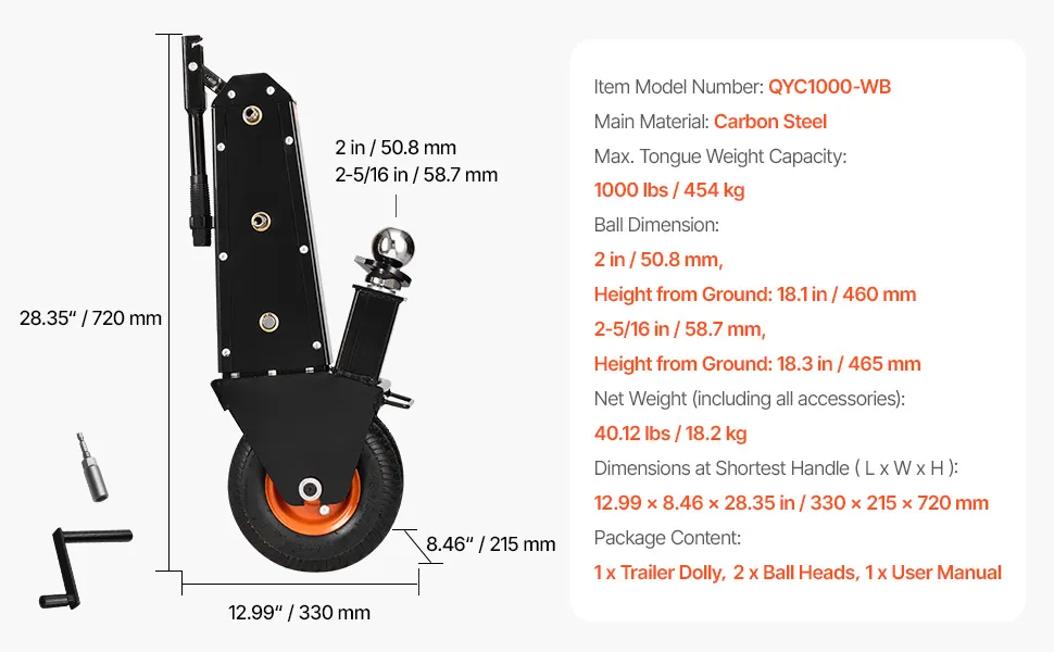 Elevata capacità di carico: questo carrello per rimorchio supporta fino a 454 kg ed è dotato di sfere di aggancio intercambiabili, offrendo opzioni di dimensioni delle sfere. Gestisce senza sforzo il traino di vari rimorchi e barche pesanti, rendendo il tuo trasloco più fluido e più comodo