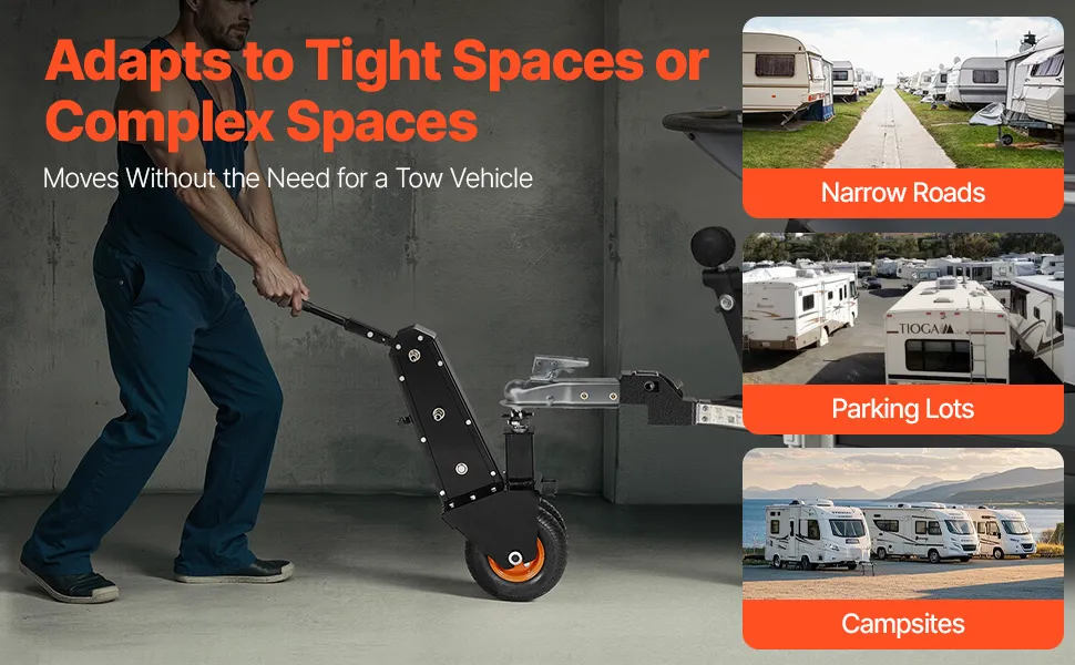 Progettato con uno sterzo flessibile e una struttura robusta, questo carrello per la movimentazione dei rimorchi consente di manovrare facilmente i rimorchi in spazi limitati, come parcheggi e aree strette.