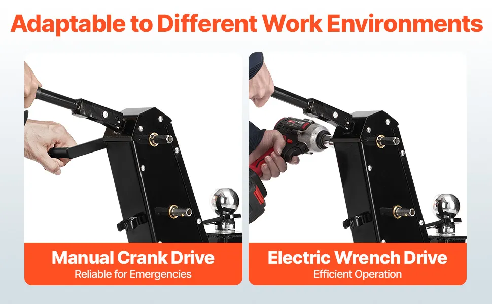Opzioni di doppia trazione: questo carrello di traino per rimorchi è dotato sia di manovella manuale che di chiave elettrica. La trazione manuale è ideale per le emergenze, mentre la chiave elettrica rende il traino più efficiente. Passa facilmente da una modalità all'altra per adattarti a vari ambienti di lavoro