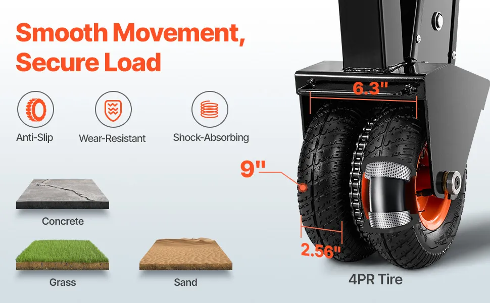 Dotato di pneumatici appositamente progettati con materiali e disegni del battistrada esclusivi, questo carrello da traino garantisce un attrito e una stabilità eccellenti, impedendo slittamenti o perdite di controllo su diverse superfici.