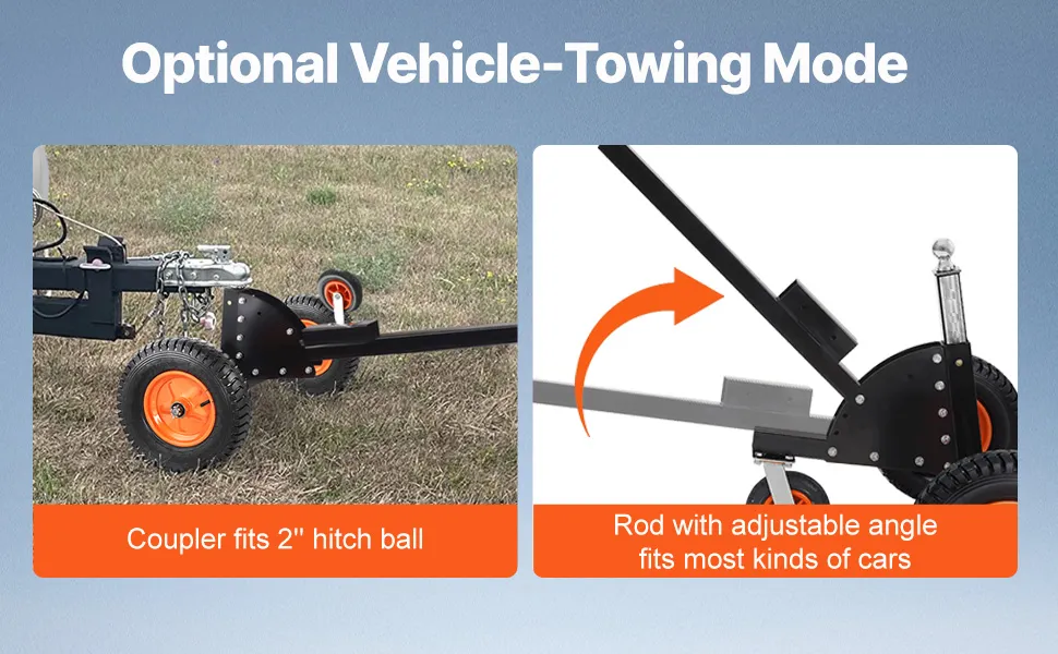 Due modi di traino: questo carrello di traino per rimorchi può essere commutato dalla modalità di traino manuale alla modalità di traino del veicolo. Puoi spostare i tuoi rimorchi con un'auto, risparmiando tempo ed energia. Inoltre, la maniglia è regolabile in angolazione per adattarsi alle tue auto