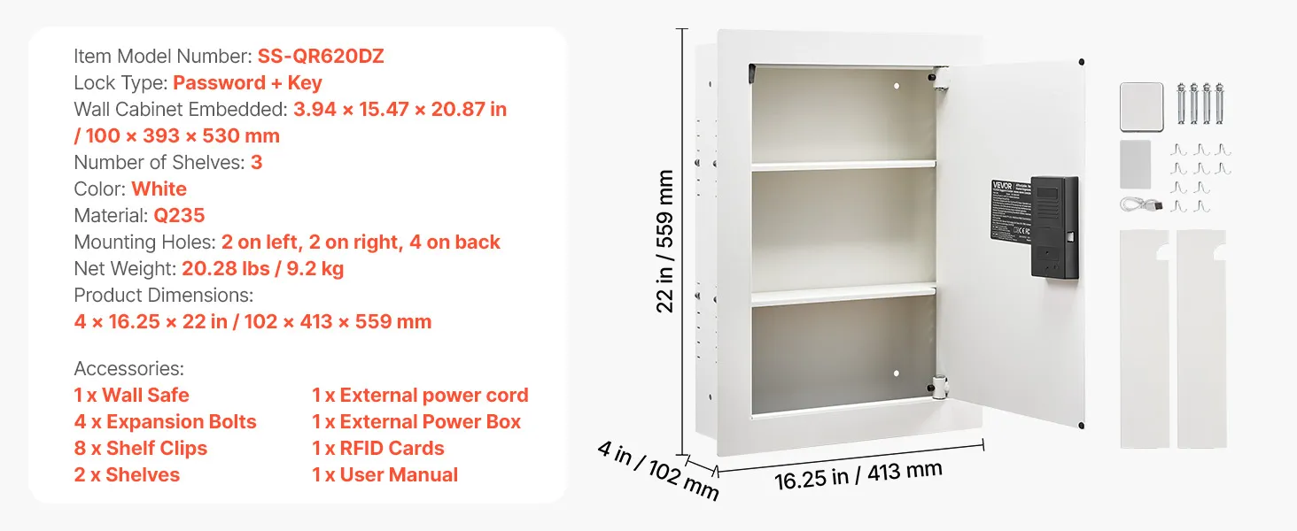 VEVOR Cassaforte a Muro da 102 x 413 x 559 mm con Password e Chiave, Alloggiamento Integrato in Acciaio Laminato a Freddo Q235 con Ripiani Regolabili e Illuminazione a LED, per Denaro, Gioielli