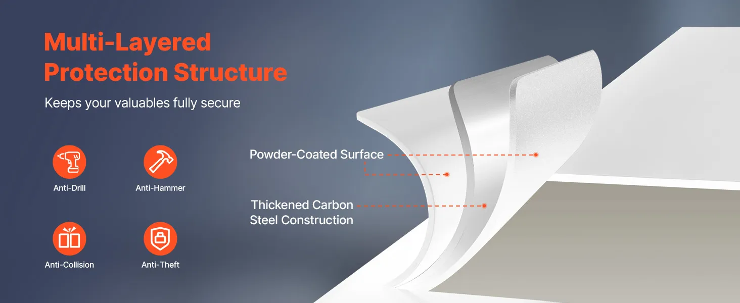 Robusta e durevole: cassaforte a muro, realizzata in acciaio al carbonio ad alta resistenza da 2,35 mm di spessore, offre un'eccellente resistenza alla pressione e agli urti. Resiste efficacemente a urti accidentali e tentativi di effrazione