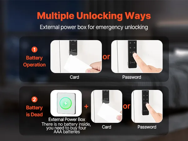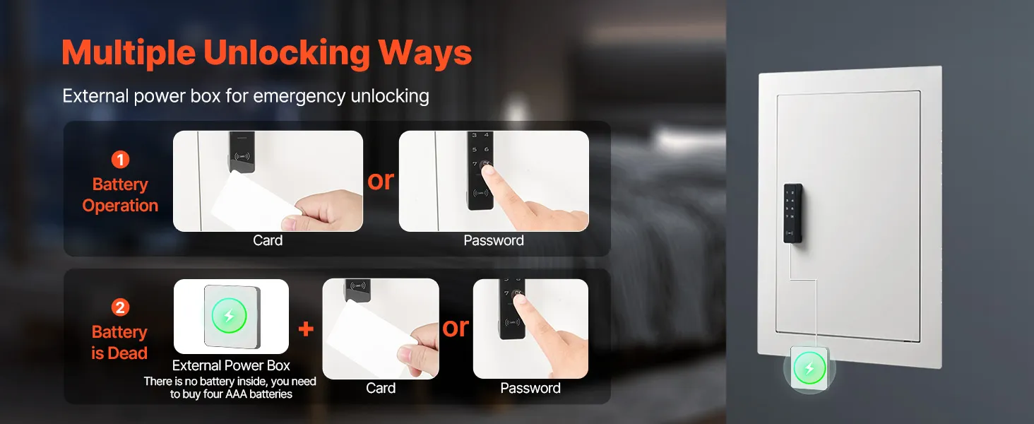 Molteplici opzioni di sblocco: la nostra cassaforte a muro offre accesso tramite tessera e password per l'uso quotidiano. In caso di smarrimento delle chiavi o di batteria scarica, un alimentatore esterno consente lo sblocco di emergenza