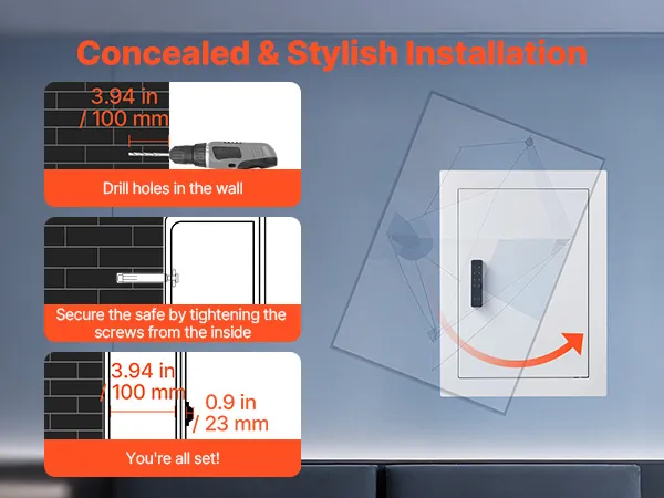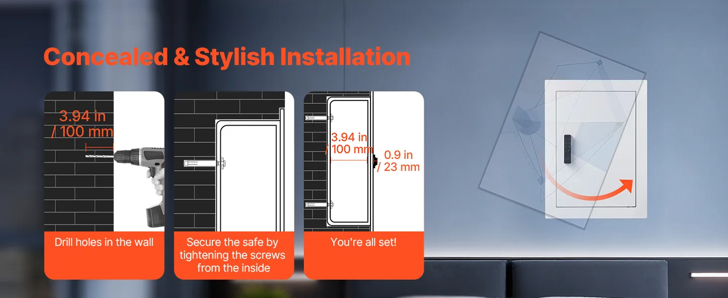 Questa cassaforte a muro è progettata per una facile installazione e si integra nella parete grazie al suo design discreto. Una volta installata, si integra con il tuo arredamento, offrendo al contempo una protezione affidabile per i tuoi oggetti di valore.