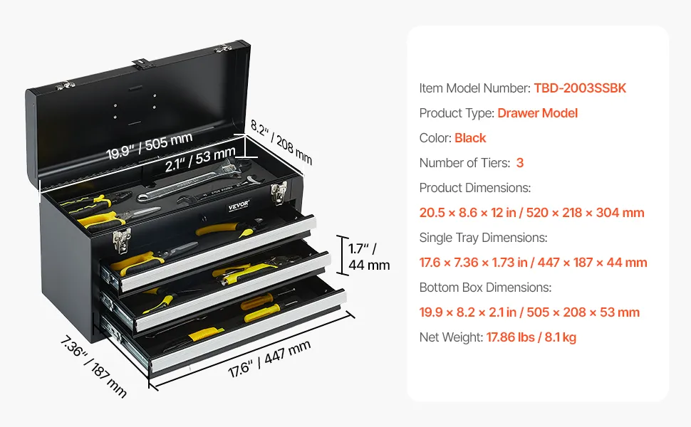 Ampio spazio di archiviazione: la cassetta degli attrezzi portatile in metallo misura 20,5 x 8,6 x 12 pollici e pesa 17,86 libbre, il che la rende ideale per trasportare gli attrezzi mentre si lavora in movimento o per riporli nel bagagliaio del veicolo. È dotata di 1 scatola superiore (19,9 x 8,2 x 2,1 pollici) e 3 cassetti (17,6 x 7,36 x 1,73 pollici)